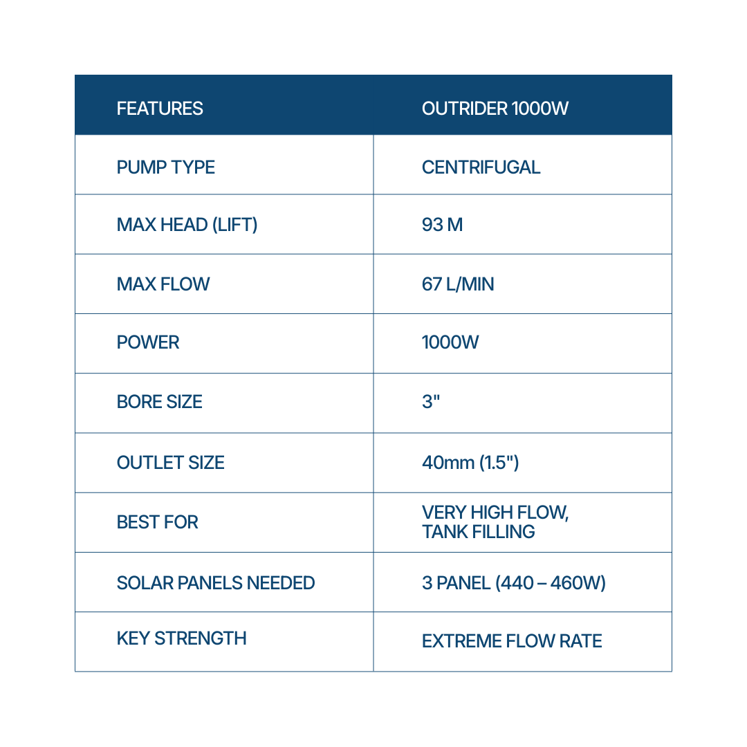 The Outback Trailblazer AC/DC 1000W is a high-flow solar bore pump kit engineered for applications where volume delivery is the priority. Designed for large tank filling, irrigation supply, water transfer, and demanding agricultural systems, the Trailblazer delivers exceptional flow performance while retaining strong head capability.